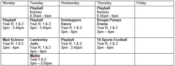 A number of after-school clubs are held during the week. Each club is run by a provider who uses the school facilities for the venue. Clubs usually run for approximately 10 weeks excluding half term and Inset Days.